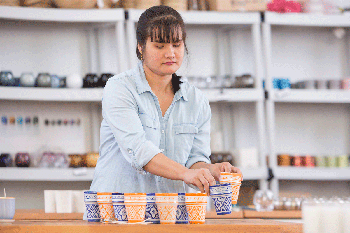 Today we make candles, spa products, gift sets and more in a beautiful sunlit studio, employing women artisans building a brighter future in the U.S. after living for years as refugees, and supporting refugee families around the world.
