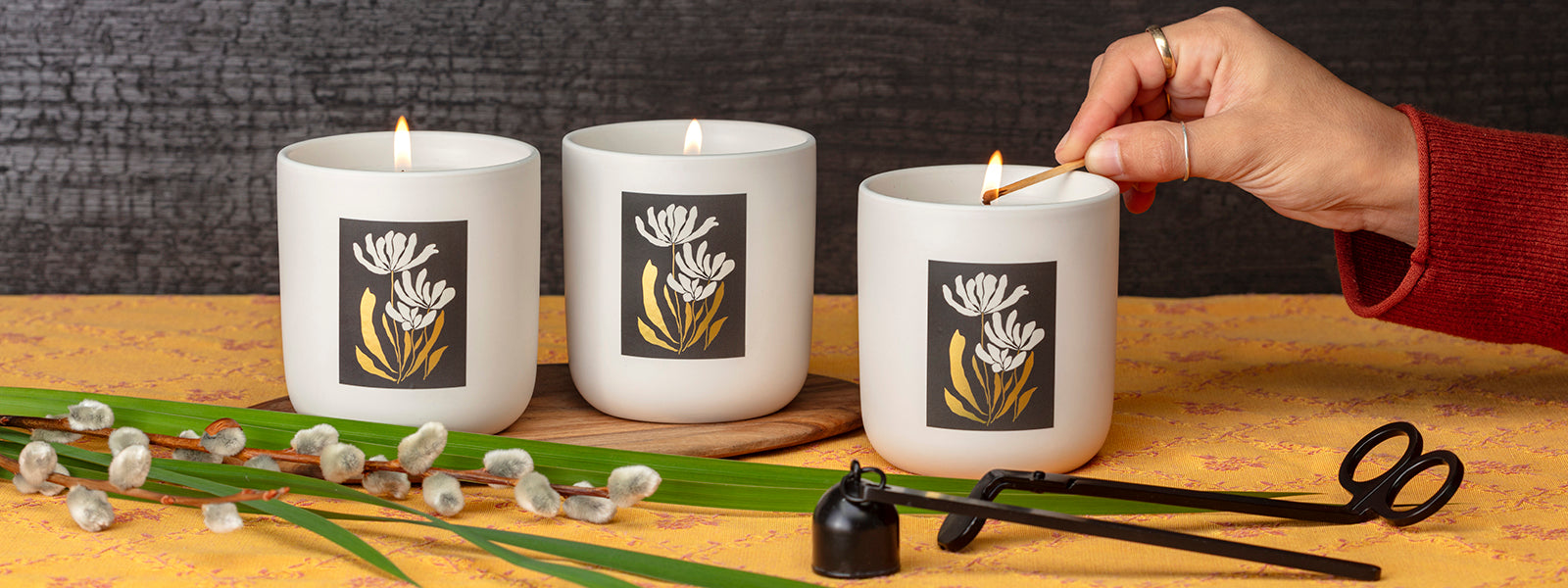 Renewable coconut-soy wax, natural cotton and wood wicks, and premium fragrance made with essential oils. Never any dyes or enhancers.